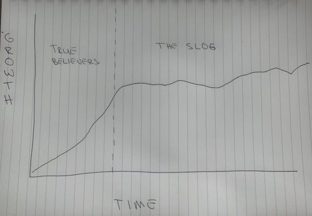 This summer, many in digital publishing are hitting the wall. The effects of this wall: post-pandemic fatigue, slowed growth, uncertainty, even apathy. Like in running, this too is inevitable. We tend to celebrate the exceptions to the norm, the people who strike a chord and see growth take off with a squiggly line up and to the right -- or that’s how it looks in the Substack analytics screenshots shared on Twitter. For most people, this isn’t reality. Growth isn’t a hockey stick but a plateauing with, ideally, mostly steady progress.