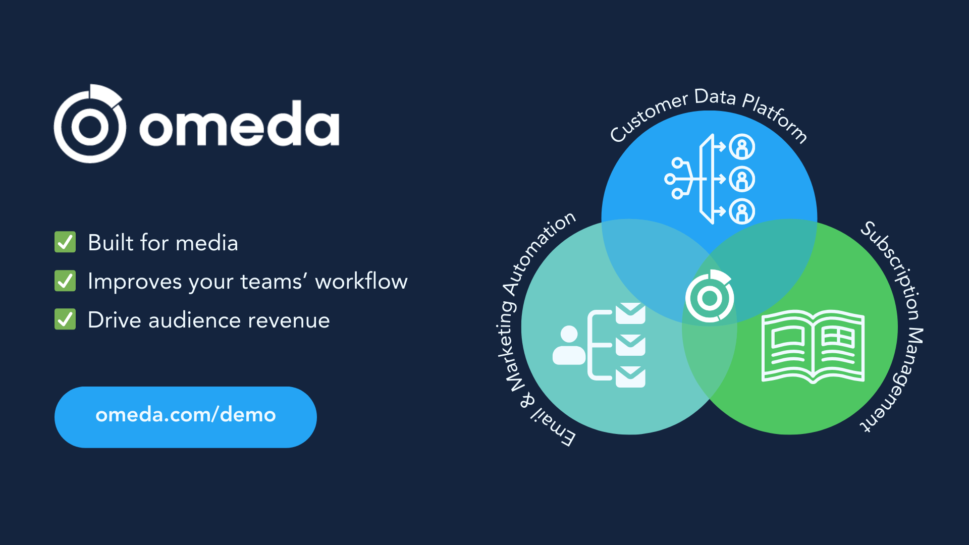 Omeda’s here to help: We combine a customer data platform (CDP), email and marketing automation, and subscription management into one tool. So you can manage and activate your audience — all while simplifying your team’s workflows and driving revenue.